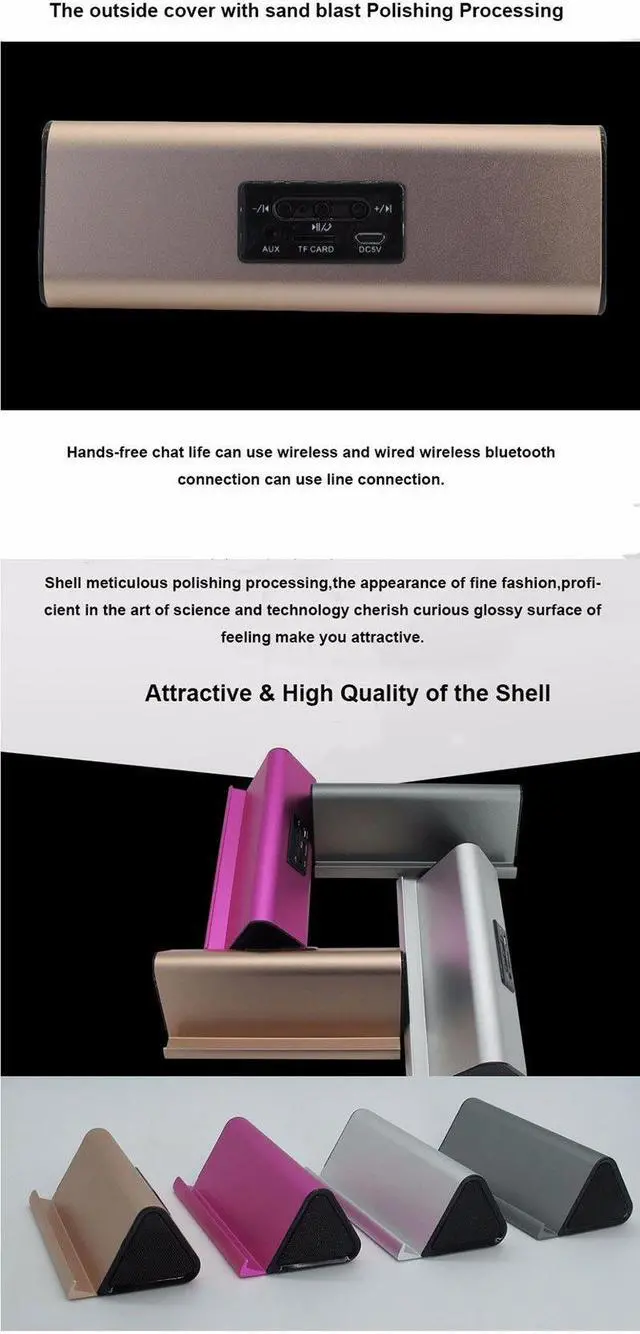 Interface Type: USB Feature: None Material: Metal Model Number: BT-10 Wireless Type: Bluetooth Item: Portable Bluetooth Speaker Color: Pink, Gold ,Silver , Coffee Speaker Type: Surround Package: Yes Quality: High Quality Sound Use: Portable Audio Player,Mobile Phone Feature1: Wireless Speakers Feature2: Speaker For Phone Feature3: Phone Viewing Stand Dock Feature4: Handsfree for Smartphone TF Card Bluetooth Specifications: 4.1+ EDP (A2DP) version Working hours: 5 hours or more Bluetooth transmission distance: 10 meters Charging mode: Micro USB 5V Output: 6W Product Size: 150 * 70 * 48mm Battery capacity: 600mA Weight: 340g 1* Bluetooth Speaker 1* Instructions 1* USB charging cable 1* 3.5mm audio cable
