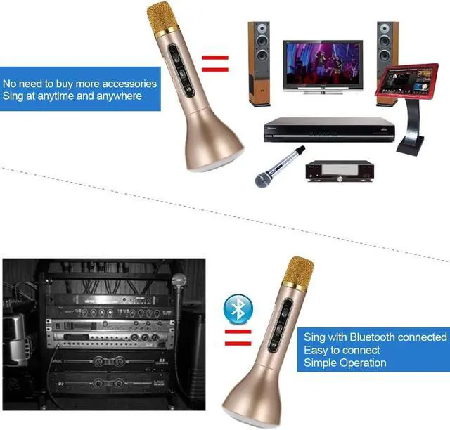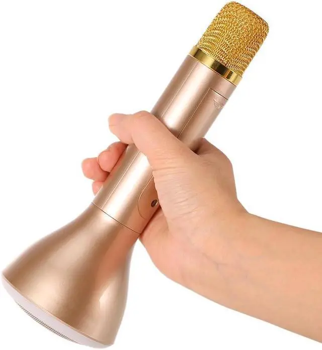 K188 condenser microphone is the best choice for singing or recording without going to KTV. With it, it can capture your voice with pickup hole without aiming at microphone and you can enjoy an audio feast with echo reverberation technology. You can connect with your phone with cable or Bluetooth function and It supports almost singing software no matter on the phone or on the computer with millions of songs for you to choose. No need to buy more accessories and simple operation which favors by people who practice singing, recording, etc. Model: K188 Bluetooth: V3.0 Bluetooth Chip: JL Pickup: Condenser Reverb Mode: Echo reverberation Impedance: 4 ohm Sensitivity: 52db Frequency Range: 150Hz-20Khz Charging Voltage: DC 5V Speaker Power: 5W Speaker Size: 52mm Built-in polymer battery: 1200mAh Battery Type: 1 * 18650 (not included) Using Time:2 hours LED Power: 0.8W Material: ABS Plastic + Print UV Color: Pink, Gold (Optional) Main Item Size: Approx. 22 * 8 * 8cm / 8.66 * 3.15 * 3.15in Main Item Weight: Approx. 253g / 8.91oz Package Size: Approx. 25.7 * 9.9 * 9.5cm / 10.12 * 3.90 * 3.74in Package Weight: Approx. 523g / 18.45oz Package List: 1 * Microphone 1 * USB Cable 1 * 3.5mm Audio Cable 1 * User Manual
