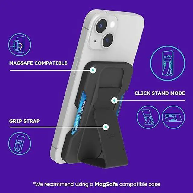 MAGSAFE COMPATIBLE The magnetic CLCKR compatible with MagSafe phone grip and card wallet is a unique, multipurpose cell phone accessory compatible with iPhone MagSafe models including iPhone 15/15 Pro/15 Plus/15 Pro Max, iPhone 14/14 Plus/14 Pro/14 Pro Max, iPhone 13 and 12 Series. It allows you to store credit, debit or business cards safely in your phone whilst also providing a secure holder for your device