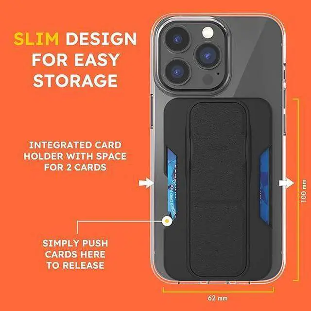 PHONE WALLET This cell phone grip strap is a designed for MagSafe wallet that keeps 2 cards safe and secure. Simply slot your cards into the wallet for a full and total protective cover and remove by pushing the card via the side notch on the left to slide out for easy access. A great phone card holder for everyday convenience, this phone wallet also comes with a 3M adhesive pad so you can even attach it to non-magnetic phone models