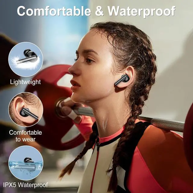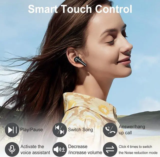 [Smart Touch Control & IPX5 Waterproof] Support dual ear touch control, can play, pause, adjust volume, answer, end calls, activate siri and switch the Noise reduction mode etc. with IPX5 waterproof, and can handle sweat and splashes.