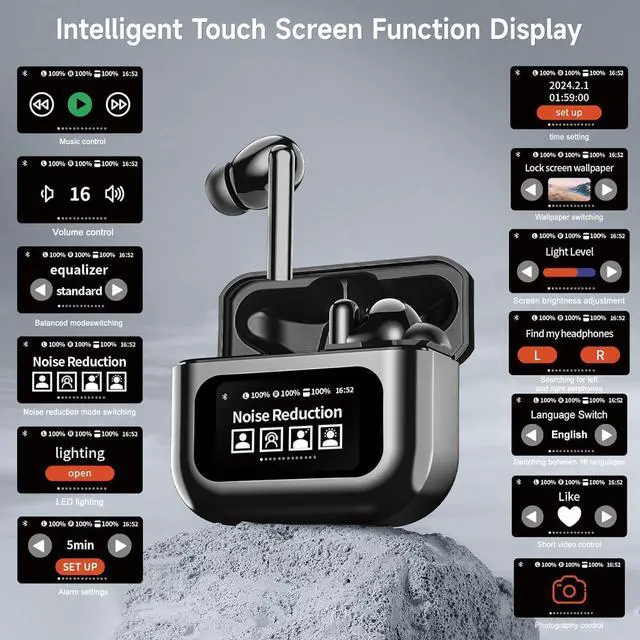 [Multi-Functional LED Touch Screen] The wireless earbuds charging case applies a unique and intelligent LED full-colour touch screen,it has up to 13 kinds of touchscreen functions, including displaying real-time power, switching music, lyrics display, volume adjustment etc..