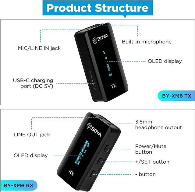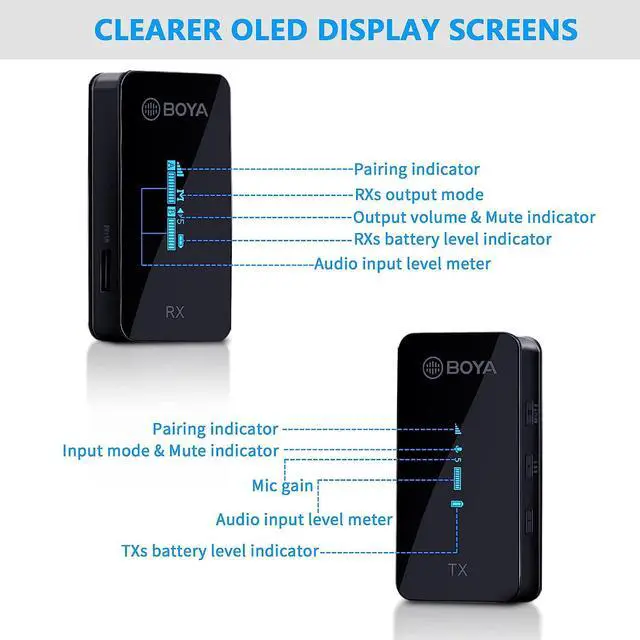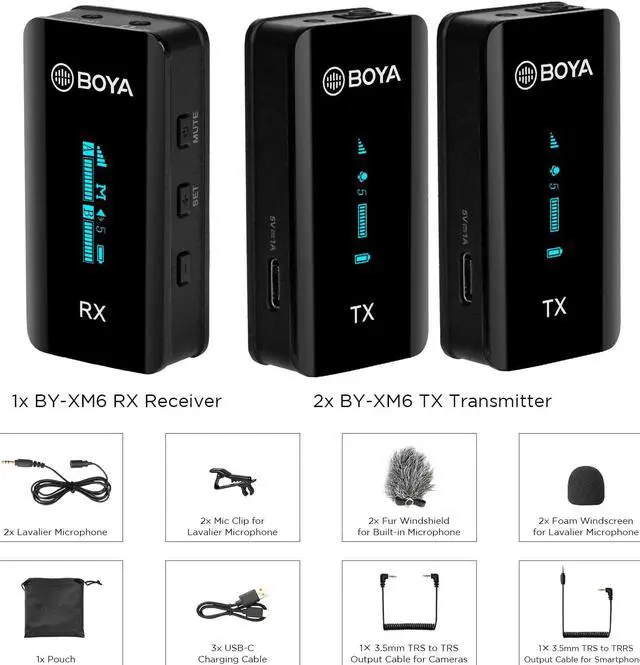 OLED display and a variety of accessoriesThe BY-XM6 microphone with OLED display, you can check the pairing status, battery level, audio input level, output mode and other information for precise adjustment of signal transmission; in addition, equipped with a lavalier microphone that can be plugged into the MIC in jack of the transmitter to capture sound; also equipped with a 3.5 mm TRS-TRS audio cable and a 3.5 mm TRS-TRRS audio cable for connecting to DSLR, cameras, smartphones and pc.