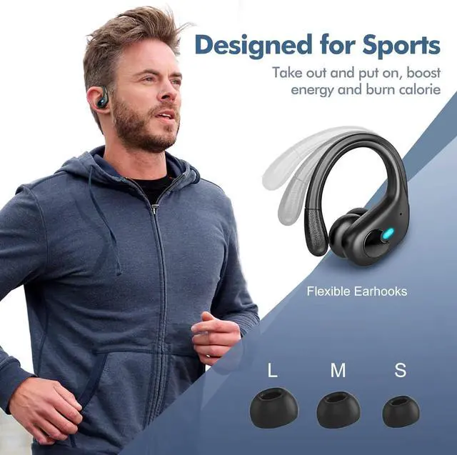 The Bluetooth earbuds with 3 pairs (S/M/L) of soft silicone wireless earphones, stable and even force. The non-slip design on the end of the earhooks will not fall off even with strenuous exercise. Featuring IPX7 rated seam sealing and nano-coating waterproof technology, making them resistant to daily sweat and rain.