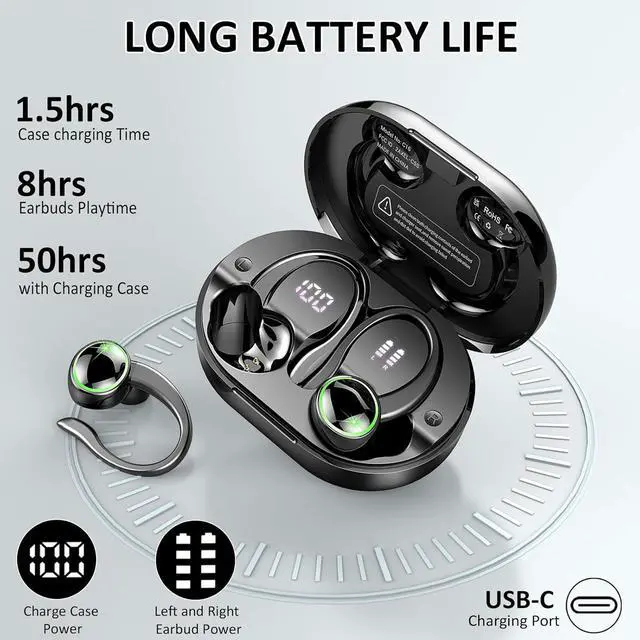 50 Hrs Playtime and Dual LED Display: Headphones with fast charging Type-C interface, the earhook headphones be fully charged for only need 1.5 hours. The wireless earbuds can last 8 hours music time from a single charge and provides extra 40 hours playtime with charging case.Wireless earphones use the unique Dual LED display technology to accurately display the remaining power of earbuds and charging case so you can master the time to charge it.