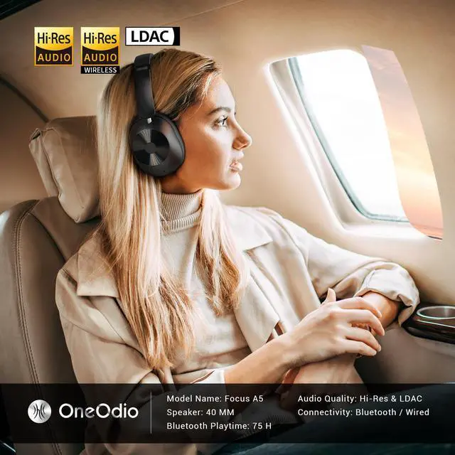 With Hybrid ANC technology, noise cancellation depth up to -45dB: The OneOdio Focus A5 Noise Canceling Headphones utilize Hybrid Active Noise Cancellation (HANC) technology, which places a microphone on the outside of the headset and one on the inside to both capture external ambient noise as well as detecting noise inside the ear canal for more accurate and efficient noise cancellation. The Focus A5 noise cancellation depth of -45dB can capture and filter up to 98% of low-frequency ambient noise.