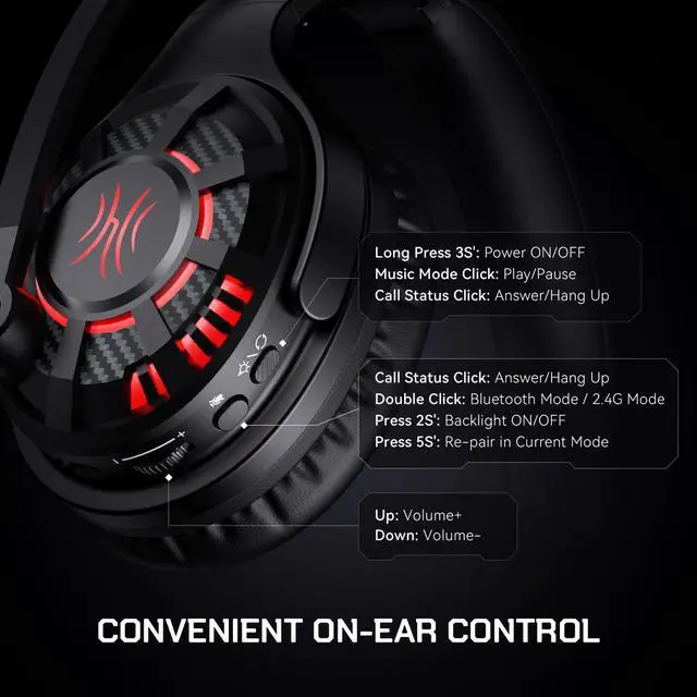 Unlike Bluetooth, 2.4 GHz provides low latency and fast data transmission. The G19BT gaming headset can switch to 2.4GH z wireless mode with one click, achieving ultra-low latency lossless technology, thereby outputting high-fidelity audio. The audio delay is less than 30 milliseconds, which is better than Bluetooth's 100 milliseconds, providing an immersive, latency-free wireless gaming experience.