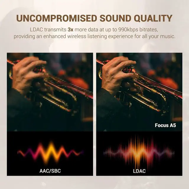 Studio-Grade Sound, Wherever You Are. Focus A5 noise cancelling headphones support LDAC for Hi-Res Audio Wireless sound. LDAC enables the transmission of audio content, including High Resolution (Hi-Res) Audio, at the maximum bitrate of 990kbps even over a Bluetooth connection. With 3x the data transmitted, LDAC provides an enhanced wireless listening experience for all your music.