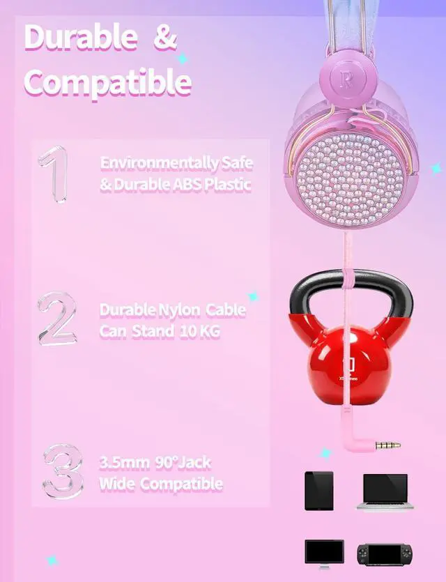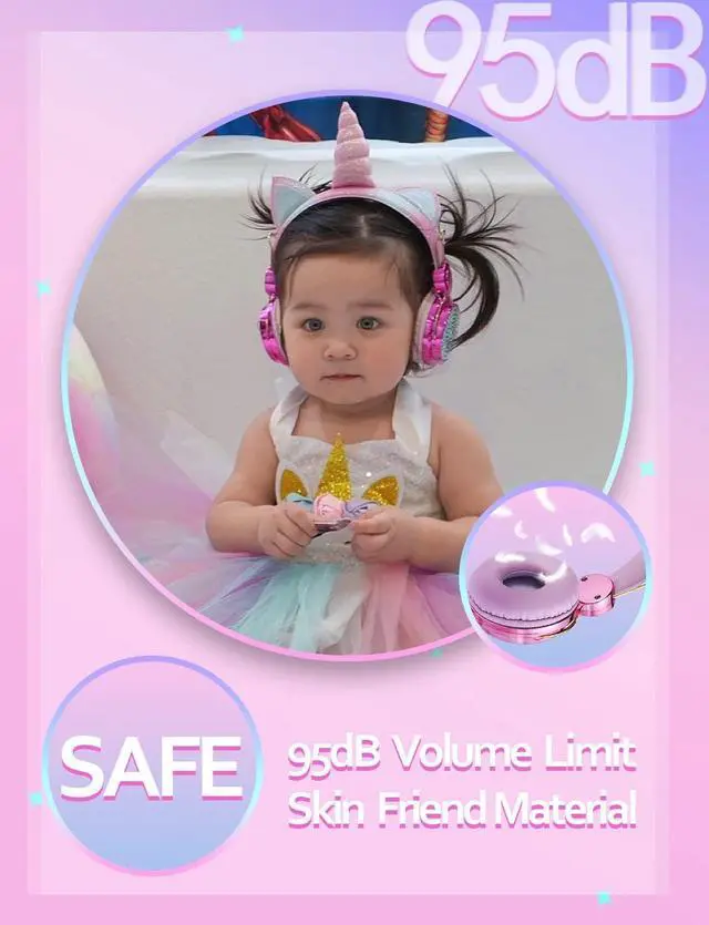 Safe: Function of 95dB volume limit and skin friend material ensure safe listening experience for kids