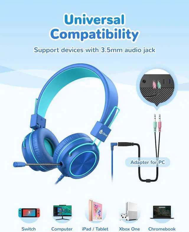 Wide Compatibility: The kids headset with microphone are perfect for the devices such as Chromebook, Tablets, PS4, Xbox One, Switch, iPad or Smartphone using the 3.5 mm jack. Use the Audio Adapter for PC, you can connect the headphones with audio and microphone insert to your computer.