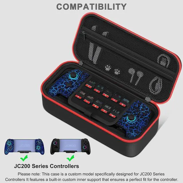 JC200 Series Controller: The switch carrying case hold our full size switch controller, switch/switch OLED console, ac adapter. Large mesh pocket in the switch case can hold the usb cable, earphone and other small switch accessories. You can take your entire Switch gear on a trip or play with friends. It is very convenient to carry your Switch accessories