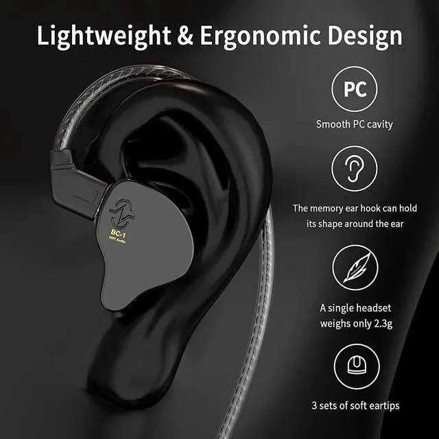 THE COMFORTS YOU WERE LOOKING FORWe didn' t just focus on sound quality, also the ultra-lightweight material and ergonomic shapes providing maximum comfort and lightness. A single headset weighs only 2.3 g. Wearing without Pressure, Releasing the Burden of Ears. There' re also 3 sets of soft eartips for different ear sizes. Wrap-around ear design keeps earbuds from slipping out while working out. The memory ear hook can hold its shape around the ear.