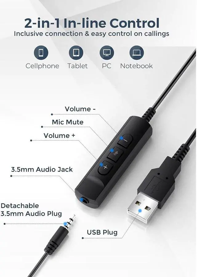 Connect to PC, tablets, cellphones, and more devices with 3.5mm audio cable, or you can connect with a USB cable for additional connection ys, along with control panel to mute Mic or adjust volumes, calls and music.