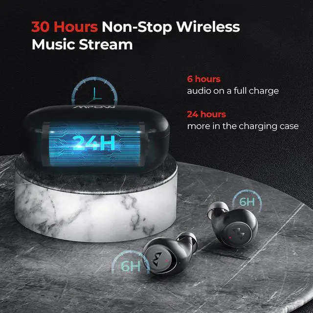 M7 earbuds offer up to 6 hours of music playing with one full charge. 24 hours more are stored in the charging case. Thats 30 hours in total. If you use 2 earbuds interchangeably, the time would be longer.