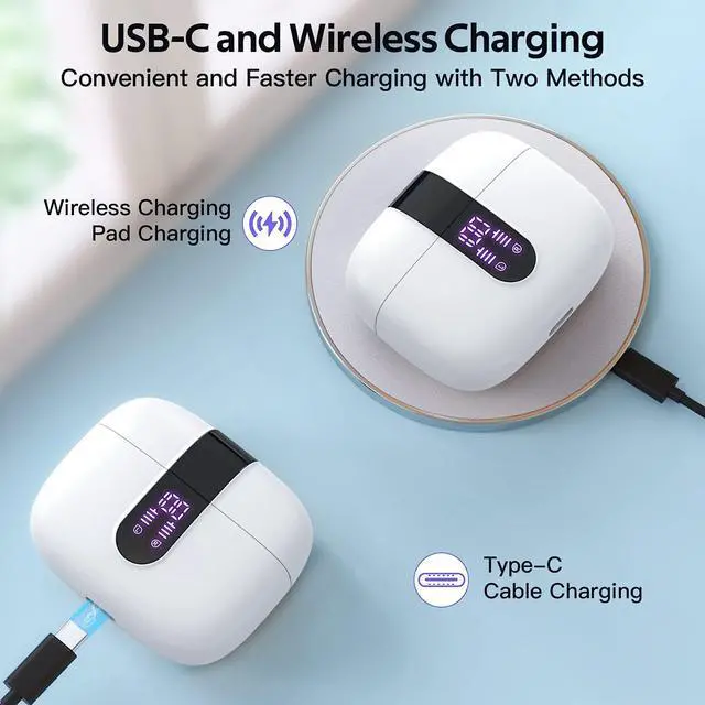 Wireless Charging and IPX5 Waterproof: The charging case of these bluetooth earbuds support wireless charging and USB C cable charging. These wireless headphones are rating at IPX5 waterproof, the nano-coating on earbuds surface can prevent water and sweat from penetrating, which can use as sport wireless headsets. You can listen to the music while running, working, reading, sleeping, meeting, etc.