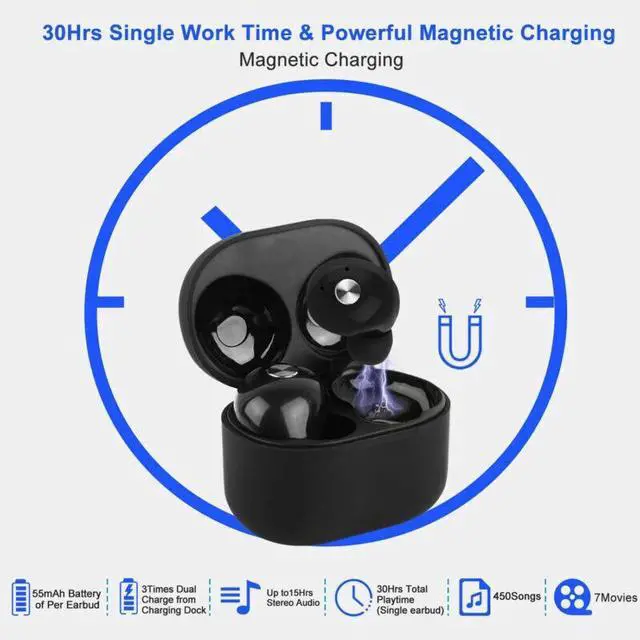 *Up to 15 Hours Stereo Audio and 30 Hours Single Experience:Get 5 hours from a single full charge,then prolong that to 15-Hr with the included charging case. Take the one earbud for single mode and leave the other earbud charging,extend music playing time from 15 hours to about 30 hours.