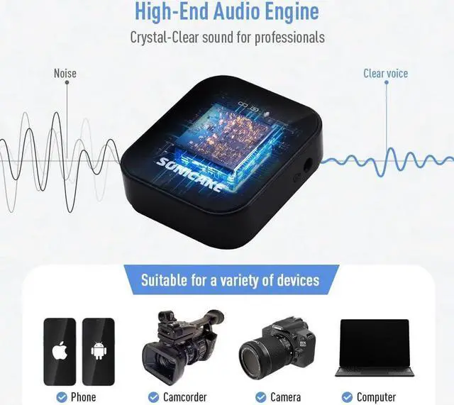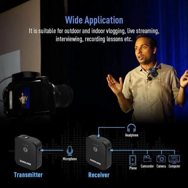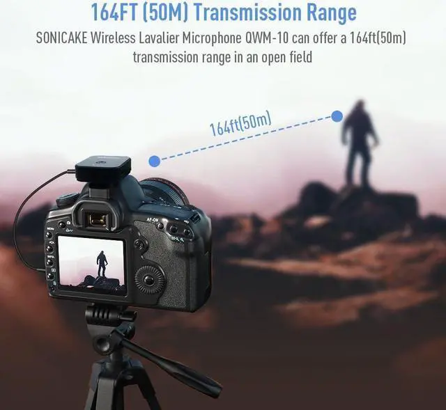 SONICAKE Wireless Lavalier Microphone System QWM-10 is a compact and lightweight wireless microphone system, consisting of a receiver and a transmitter, which can achieve a wireless distance of up to 50 meters/164 ft. QWM-10 can provide a stable wireless connection, record high-quality, low-noise, low-latency audio. Its compatible with most existing cameras/mobile phones/tablets. Its a solution for Vlog shooting, product evaluation, event speeches, live broadcasts and web conferences.