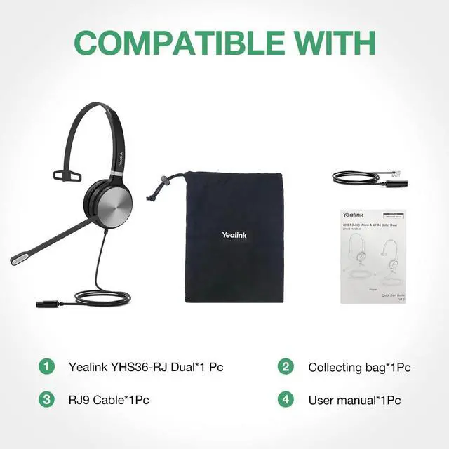 • COMPATIBILITY Yealink Desk Phones Series - T2x, T3x, T4xP/G/S/U, T5x, VP59, Teams MP/T5x, SFB MP/T5x Poly - VVX x01, VVX x10, VVX x50 SNOM - D385, D735, D765 Grandstream - GXP2135, GRP2613, GRP2604P, GXV3370 (*Please check Yealink Headset Compatibility List- h/t/t/p/s://support.yealink.com/en/portal/compatible)