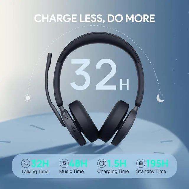 Power to Keep You Ahead: 1.5-hour fast charge delivers up to 32h calls / 48h music (BT mode) or 16h calls / 19h music (DECT mode), with 195h standby. Soft Foam, rotating earcups, adjustable headband Stereo bluetooth headphone provide all-day comfort.