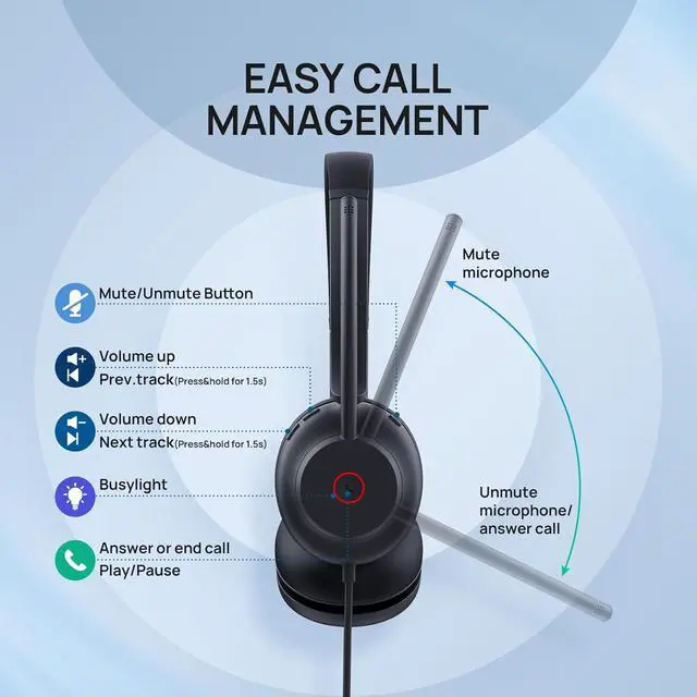 Easy Control:The usb headset has push-button controls located on the right earpiece for call management, volume adjustment, and mute functions. The on-ear control design means you can answer calls, adjust volume, and mute without reaching for your device.