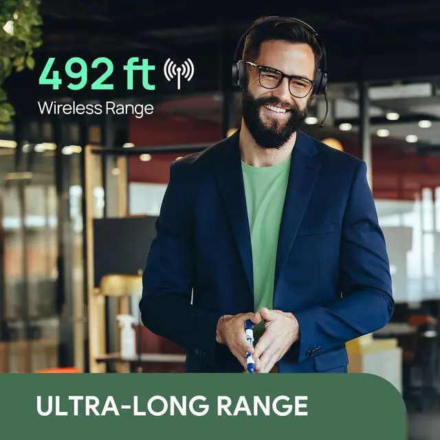 492 ft Longer Range: Advanced DECT tech delivers an impressive wireless range of 492 feet. DECT wireless headset have higher call security, greater anti-interference, and 2x deployment density of Bluetooth.