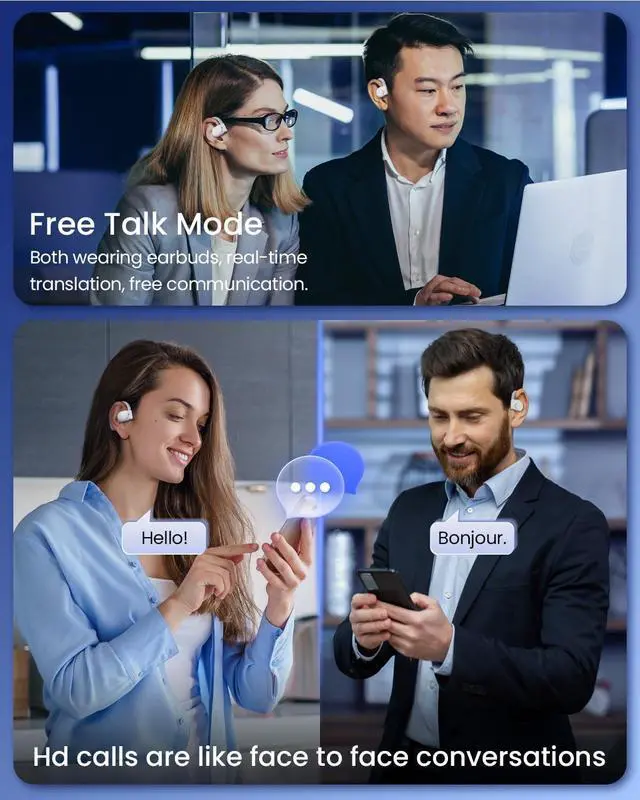 5 Translation Modes for Any Scenario: Includes Free Talk, Headphone+Phone, Audio/Video Call, Photo Translation and Translation Machine modes. Both users wear wireless translating earbuds for face-to-face chats, or use bluetooth translation ear buds and phone for seamless two-way conversation, or translate audio/video calls by sharing a link. These language translator ear buds offer real-time translating making them the perfect AI translation earbuds real time for global communication.