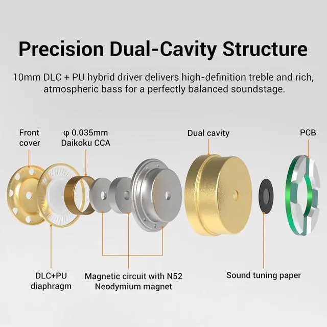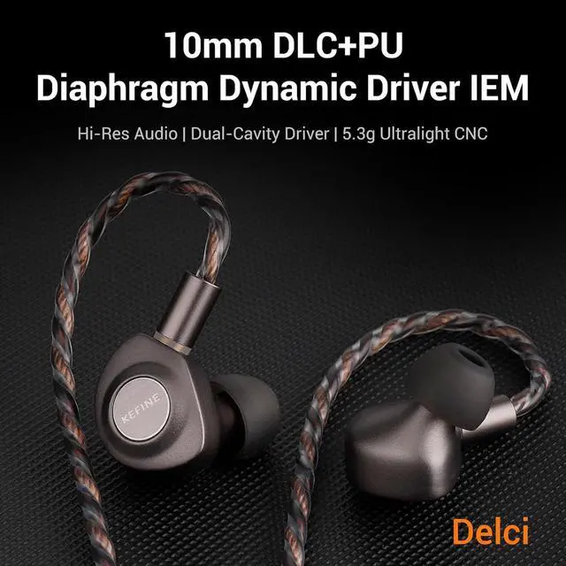10mm DLC+PU Composite DiaphragmFeaturing a custom-engineered 10mm dynamic driver, the Delci combines Diamond-Like Carbon (DLC) for high-definition clarity and PU material for a lush, balanced low-end. This unique hybrid diaphragm delivers a smooth, non-fatiguing sound with high-frequency energy and deep sub-bass extension.