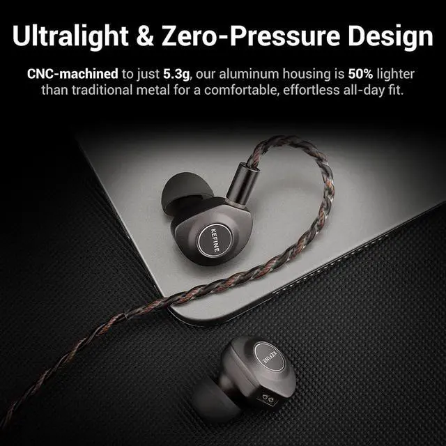 Ultralight CNC Aviation AluminumCrafted from a single block of aviation-grade aluminum via precision CNC machining, each earbud weighs only 5.3ghalf the weight of die-cast metal earphones. The gunmetal anodized finish offers an elegant, scratch-resistant texture while ensuring maximum long-term wearing comfort.