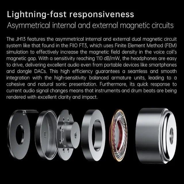 Dual Magnetic Circuit Design Inspired by FiiOs high-end FT3, the asymmetric inner-and-outer magnetic circuit increases magnetic density, achieving 110 dB/mW sensitivity. Easily driven by smartphones or portable DACs for premium Hi-Fi sound.