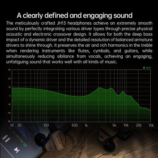 Hybrid Triple-Driver Configuration Equipped with a 10 mm dynamic driver and two custom balanced armature drivers, the JH13 delivers deep, powerful bass and crystal-clear treble for a rich, layered listening experience.