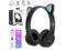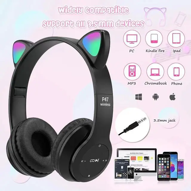 Kids Headphones, Cat Ear Wireless Headphones, LED Light Up Bluetooth over on Ear Purple Headphones for Boy Girl With Microphone, Black