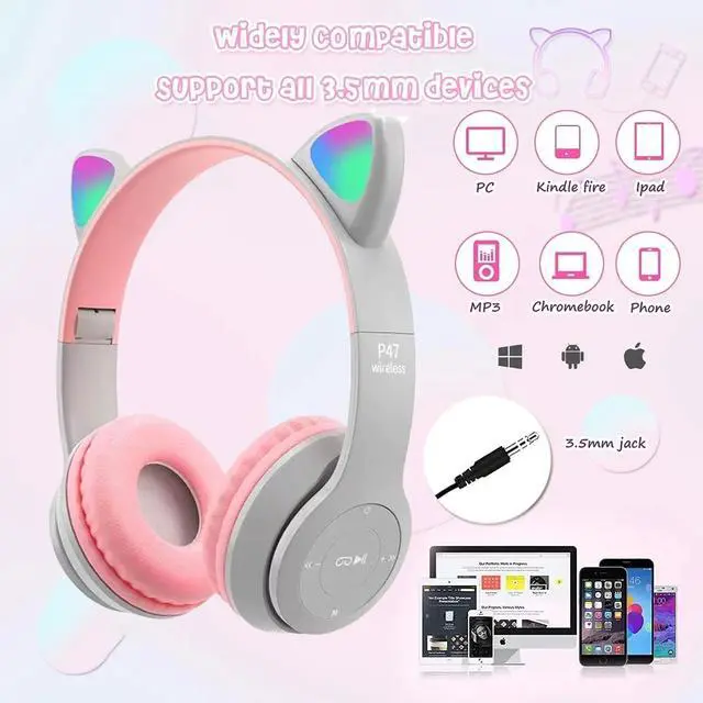 Kids Headphones, Cat Ear Wireless Headphones, LED Light Up Bluetooth over on Ear Purple Headphones for Boy Girl With Microphone, Light Gray