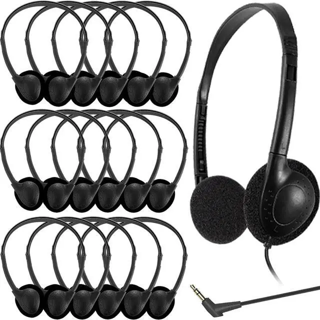 Bulk headpones for classroom with a 3.5mm jack that kids can plug into chromebook, tablet, phone, PC or smart device. Ideal for schools use, classrooms, libraries,airlines,art galleries,health centers, museums and computer classes.
