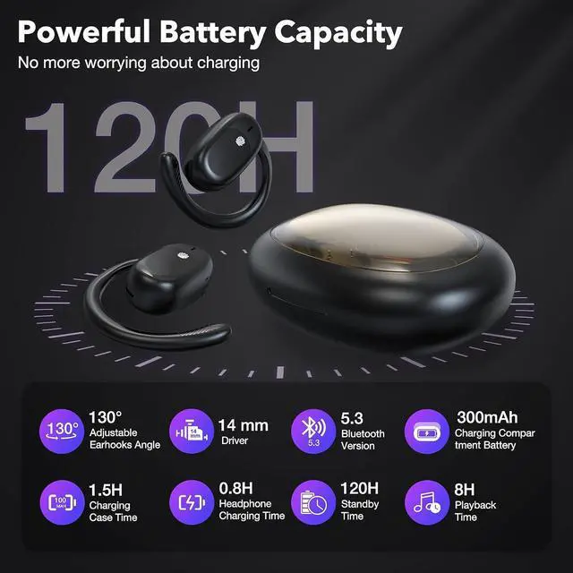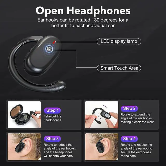[130 Degree Adjustable Earhooks] This headphone is the first to have a 130 degree adjustable ear hooks, allowing everyone to adjust the angle of the ear hooks according to their own ear size, making the earphones more suitable for your ears. The open structure of the earphones is more ergonomic.