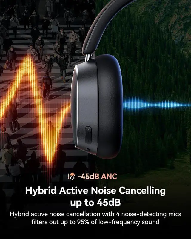- Hybrid Active Noise Cancelling: Instantly block up to 95% of ambient noise with a 4-layer hybrid ANC system. Noise cancelling headphones paired with an ultra-fast ANC chip reduce up to 45dB in 0.02s, eliminating distractions the moment you hit ANC. Switch to Transparency Mode to stay aware of your surroundings for hearing announcements, traffic, or colleagues while maintaining crystal-clear audio for music, calls, or games, making it perfect for commuting, flights, offices, or focused sessions.