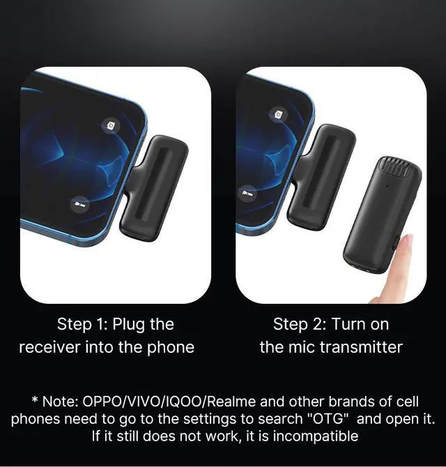 Note: OPPO/VIVO/IQOO/Realme brand mobile phones need to turn on OTG power supply to connect to this microphone