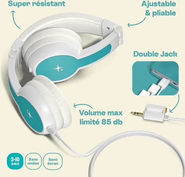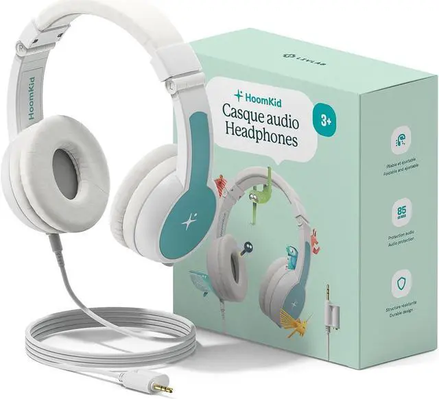 Perfect fit for smaller ears, audio headphones designed for children (Ages 3+). Ultra-resistant, foldable and adjustable. Maximum volume is limited to 85 dB (WHO recommendation) to provide a safe listening experience. Customizable with HoomKid character stickers included in the package. Sharing is made easier with a double jack, connectable to any other set of headphones, can be used anywhere - in the car, on the train, or on the plane.