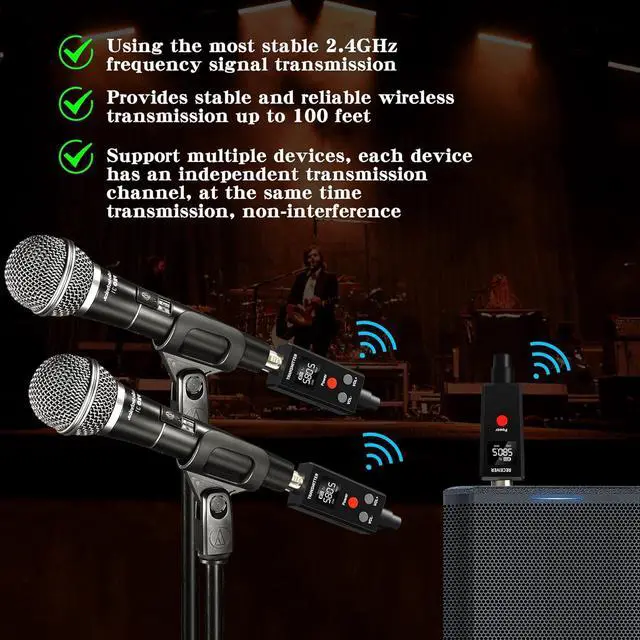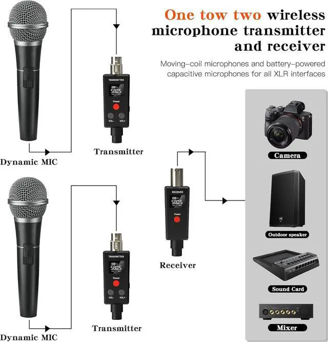 Simple and easy-to-use: XLR transmitter and XLR receiver. Support 6 sets in the same place simultaneously. Works with any dynamic/Harmonic microphone, Audio mixer, PA system, Provides stable and reliable wireless transmission. Works with any active loudspeakers, Perfect for venues, weddings and mobile DJ's. Less than 4.5 ms Latencynormal, Simultaneous broadcasts on 6 channels, plug and play, power on automatic pairing, no more Settings required.