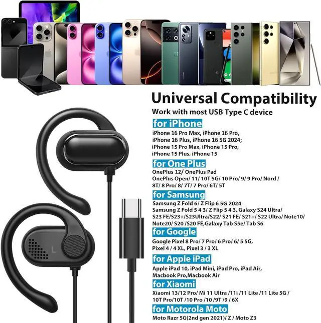 Widely Compatibility: USB C Wired Earbuds compatible with iPhone 16 Pro Max/ 16 Plus/ 16 Pro/ 16/ iPhone 15 Series, Samsung Galaxy A55/A35/A54/A53/A33, Galaxy S24 Ultra/S23 FE/ S23/S22/S21/S20, Galaxy Z Flip 6 5 4 3 2/ Z Fold 6 5 4 3 2, Galaxy Tab S9/S9+/S9 Ultra/S8/S7/S6, Google Pixel Tablet/Fold, Pixel 8 Pro/8/7 Pro/6 Pro/6A/6/5/4/4XL/3/3 XL, for iPad 10th/Pro/Mini/Air, for MacBook Pro/Air, for OnePlus 12R/12/Open/11/10 Pro/10t /9 Pro/9/8T/8 Pro/7T Pro/7, etc with USB C Audio Port Devices