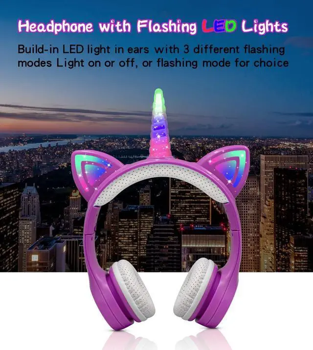 Flashing Light: foldable Unicorn cat ear wireless headset, designed with LED cat ear light and unicorn horn, embedded with red / Blue / green LED cat ear and horn can flash, and change color with the change of rhythm. It is an ideal gift for toddlers, girls, boys, students or role-playing fans