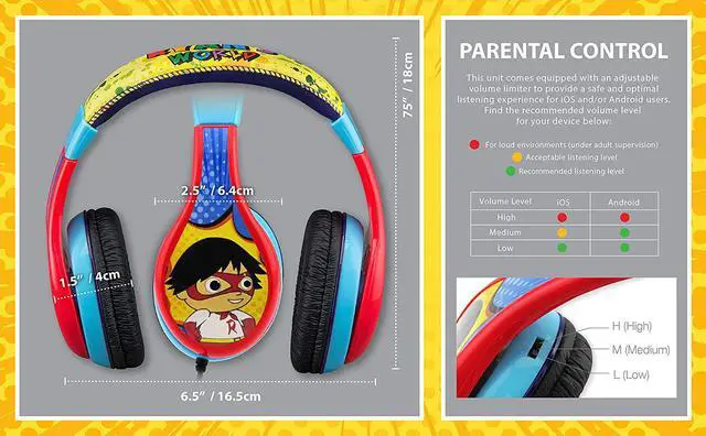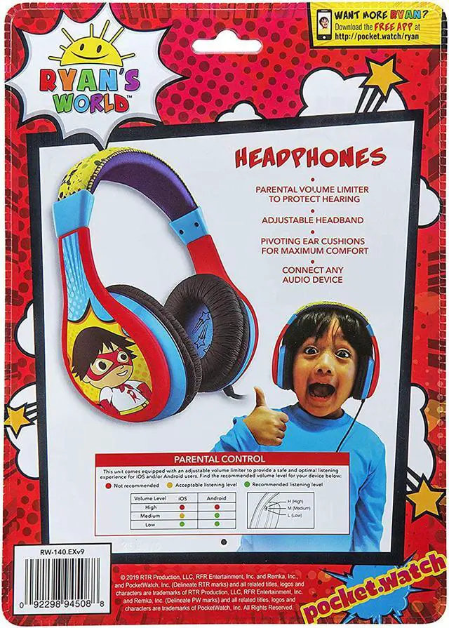 Ryans World Design: Over ear headphones feature colorful graphics inspired by the popular show. Looks great on any fan of Ryans World!
