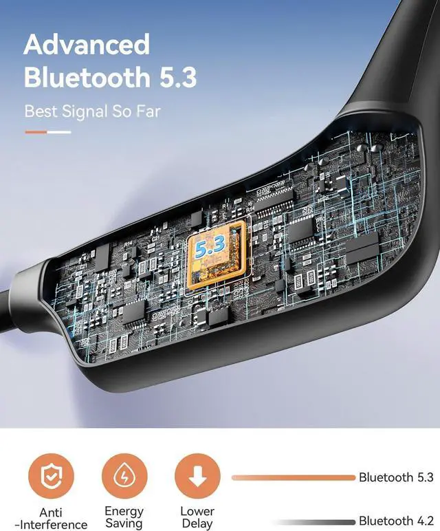 Advanced Bluetooth 5.3T rue bone conduction headphone utilizes advanced Bluetooth 5.3 technology, achieving a 48Mbit/s transmission rate and a 300-meter transmission distance. The ultra-low transmission latency significantly enhances the music experience, while also supporting AAC/SBC high-quality audio for music enjoyment comparable to AirPods.