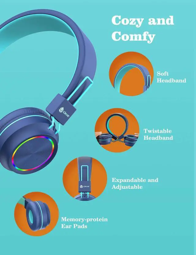 Safe Volume & Colorful Lights: Looks cool, sounds great! To protect kids' hearing, the Kids headphones are limited to an output of 85dB. In addition to the 40mm drivers that deliver full, immersive sound to the iClever kids Bluetooth headphones, they also feature a set of LED lights that run around the edges of the earpiece for an awesome, stylish look!