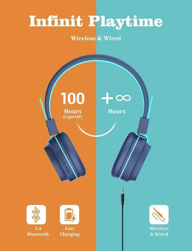 Long Battery Life: Whether you' re on a family road trip, the kids are walking to school or they are doing homework, the bluetooth headphones for kids will give you 100 hours with the lights off or 35 hours with the lights on on a single charge. Use the 3.5 mm backup jack when you want to charge the kids wireless headphones and listen at the same time.