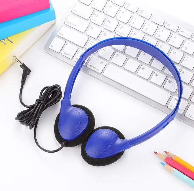 Bulk headphones for classroom with a 3.5 mm jack that kids can plug into Chromebook computer laptop.