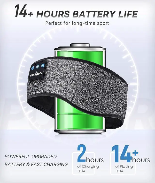 QUICK CHARGE & EXTENDED PLAYTIME: Equipped with a 200mAh high-performance battery and Type C charging port, MUSICOZY sleep headphones require just 1-2 hours of charging for over 14 hours of continuous playback; ideal for extended use during travel, work, or relaxation; enjoy your favorite music or podcasts without interruption