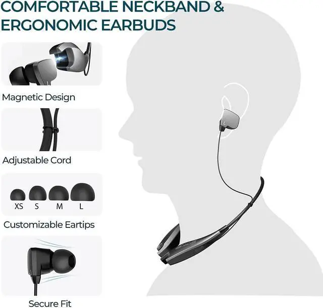 Stability: The neckband earbuds come with 4 pairs of soft silicone eartips in 4 different sizes (XS/S/M/L) which fit 99% ear canals, just select the most suitable one to get the most comfortable in-ear wearing feeling