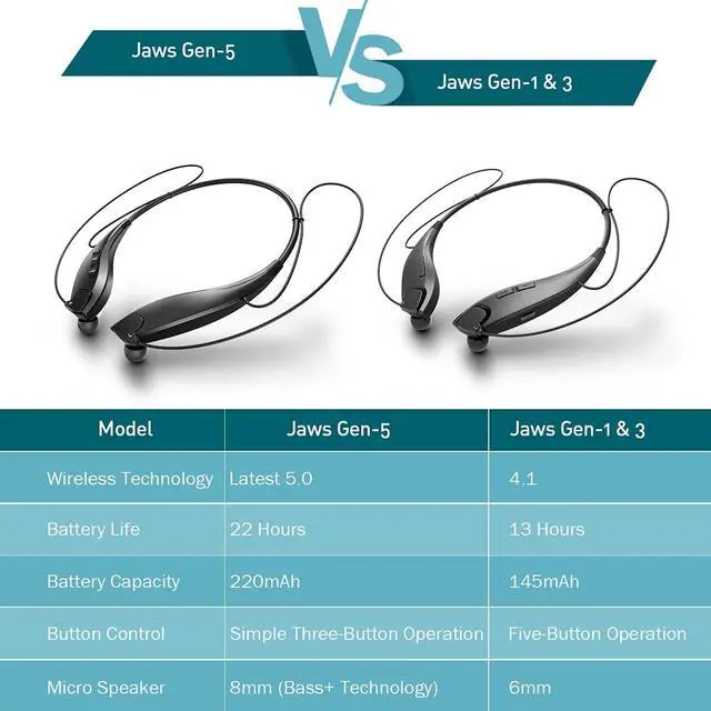 Fast Charging Technology: Jaws Bluetooth 5.0 headphones with powerful rechargeable 220mAh battery provide you with 22 hours of non-stop playtime by dint of advanced low-power consumption chip. Listen to the consecutive music a full day. Charge 10 minutes, use for 4 hours due to its fast wireless charging technology. One USB charging cable comes with the box