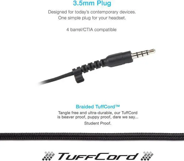 DURABLE DESIGN These headsets are hardwearing and long lasting which is vital when being frequently used in school and businesses The thick braided TuffCord is ultra-durable and student proof!