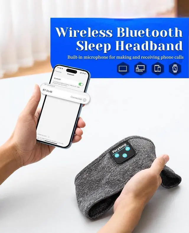 HD Hi Fi Audio Sound & Bluetooth-compatible Perytong sleep headphones built in stereo speaker and microphone, provide high quality digital sound. Bluetooth headband headphones for sleeping offer a range of up to 45 feet, sleep headband will connect to any bluetooth phone or portable device. The sleep mask with bluetooth headphones not only gives users attractive & stylish look, but also bring them superior sound quality when sleeping, running, or practicing yoga.